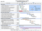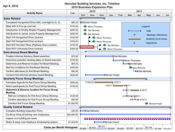 This schedule tracks milestones, meetings, and other information associated with a yearlong business expansion project. The schedule shows multiple milestones per row and tracks cost per month via a summary graph at the bottom of the schedule. Formatted for easy export to Keynote or PowerPoint.