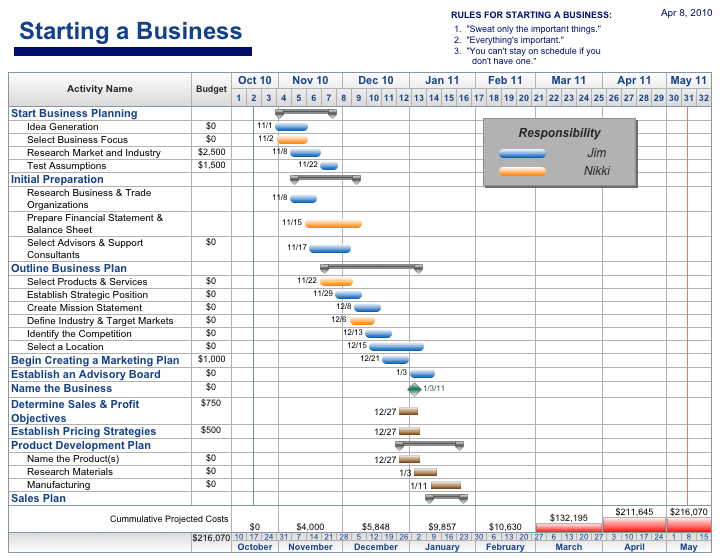 This schedule contains a detailed approach for planning, developing, and launching a new business. Activities are grouped within relevant phases and time period summaries track fixed, resource, and total costs. Text boxes and automated data are provided in the schedule headers and footers. Formatted for easy export to Keynote or PowerPoint.