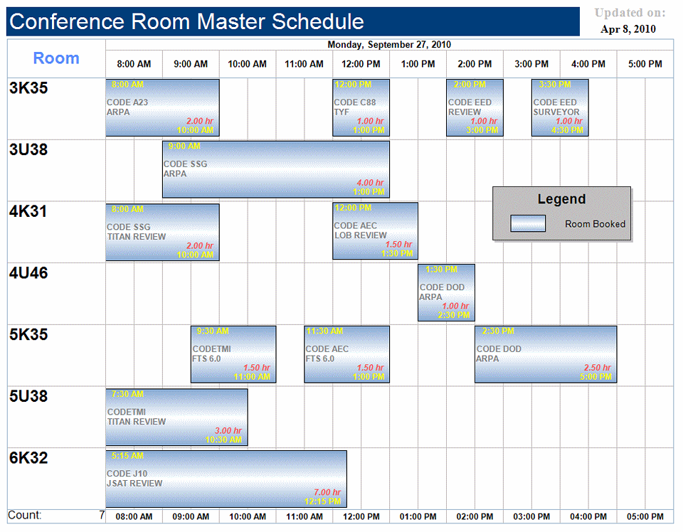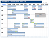 This unique schedule employs custom bar styles for tracking meetings within several conference rooms. Hourly timeline is formatted to display meeting schedule for each day on a single page. Formatted for easy export to Keynote or PowerPoint.