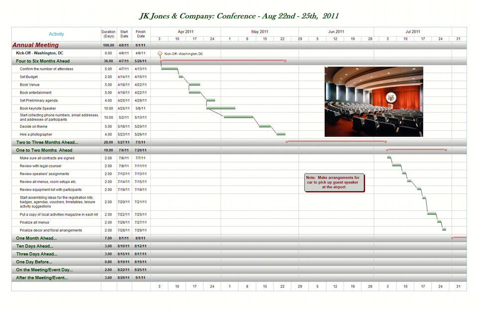 This schedule defines the many tasks associated with planning a business event or meeting. Pre-event and post-event tasks are organized chronologically.
