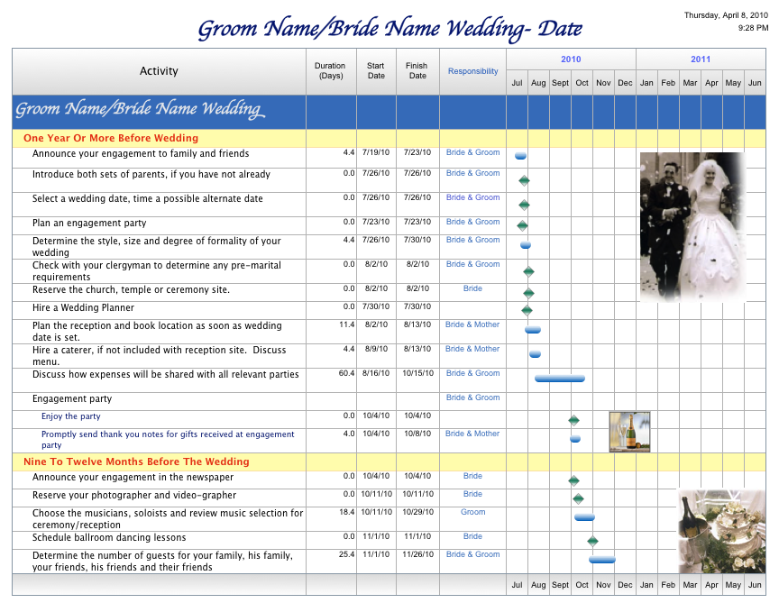 This useful schedule provides a road map for the many steps involved in planning a wedding. Activities are segmented in relevant time periods with columns for tracking responsibilities as well as budgeted and actual costs.