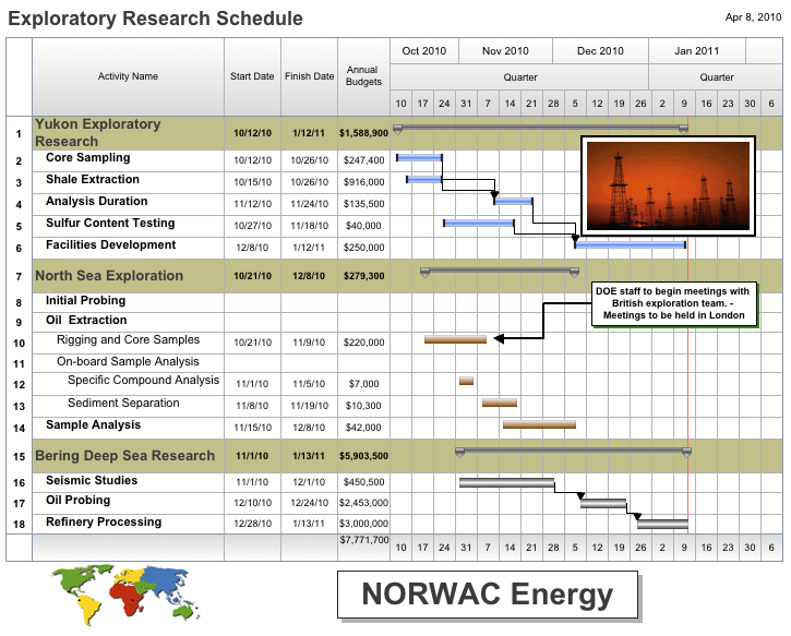 This schedule provides a top-level view of the major phases involved with exploratory energy research. Budgetary expenditures are also displayed. Formatted for easy export to Keynote or PowerPoint.