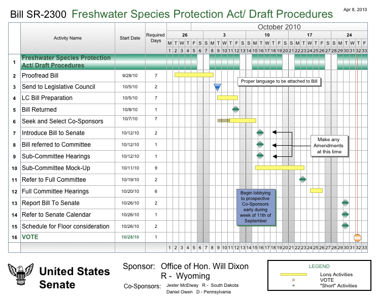 This schedule tracks the lifecycle of a bill including the various steps the proposed legislation must successfully pass through before a vote is cast. The headers and footers included in the file containg bar legends, images, text boxes, and automated data fields. Formatted for easy export to Keynote or PowerPoint.