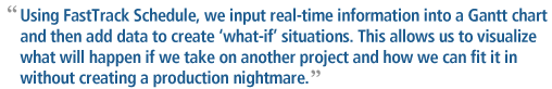 “Now using FastTrack Schedule, we input real-time information into a Gantt chart and then add data to create ‘what-if’ situations. This allows us to visualize what will happen if we take on another project and how we can fit it in without creating a production nightmare,” said Dale. “It's easy, quick and exactly what we need to be more accurate and confident in our scheduling decisions. Additionally, we can export and print those ‘what-if’ scenario charts and project plans as colorful PDF presentations and share them with whoever needs to see exactly what is going on.”