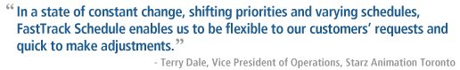“The animation industry is a very creative industry – we work with people who have big ideas, imaginative spirits and artistic breakthroughs that may arise at any minute. In a state of constant change, shifting priorities and varying schedules, FastTrack Schedule enables us to be flexible to our customers’ requests and quick to make adjustments,” explains Dale. “And FastTrack Schedule's presentation capabilities allow us to communicate those changes across departments as well as to the client directly.”